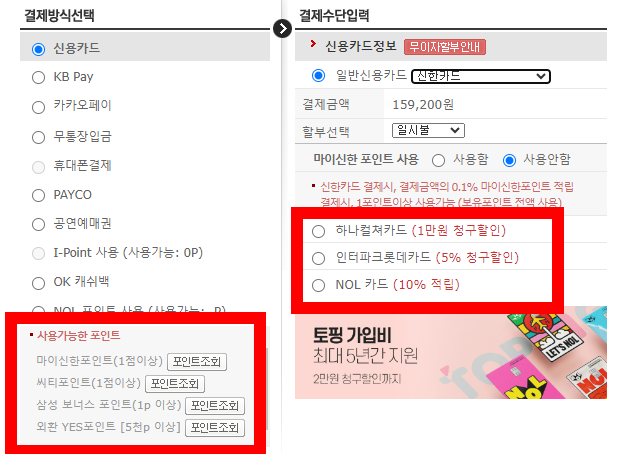 결제방식에서 각종 포인트 확인하셔서 할인받으시거나 하나컬처카드 1만 원 청구할인, 인터파크롯데카드 5% 청구할인, NOL카드 10% 적립 가능합니다.