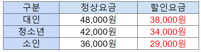- 장애인 : 종일이용권 50% (보호자(만 19세이상) 동반1인 / 장애인증 또는 복지카드 제시