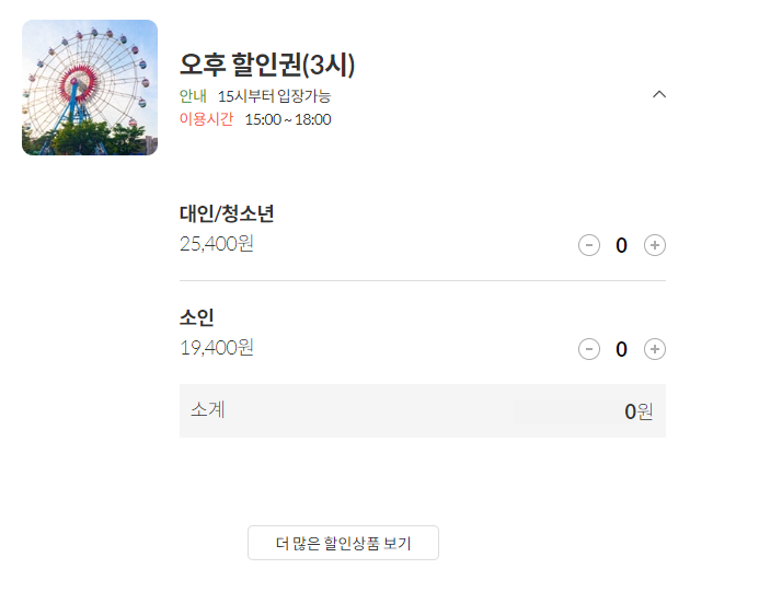 - 국가유공자: 종일이용권 50% (동반1인) 국가유공자증 제시