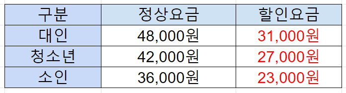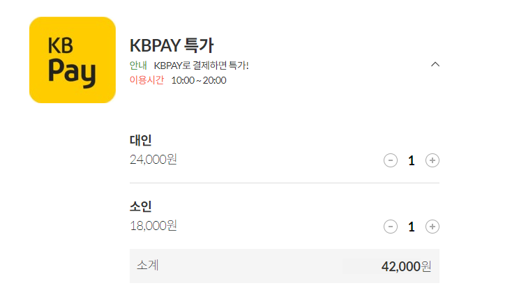 어른과 청소년은 무려 24,000원에 결제 가능 동반1인까지