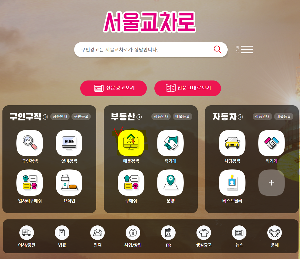교차로 신문에는 알짜 정보만 담고 있는데요. 부동산 정보를 알아보는 방법을 알려드리겠습니다. 서울 교차로 홈페이지로 들어가게 되면 부동산 카테고리 매물 검색으로 클릭하시면 됩니다.