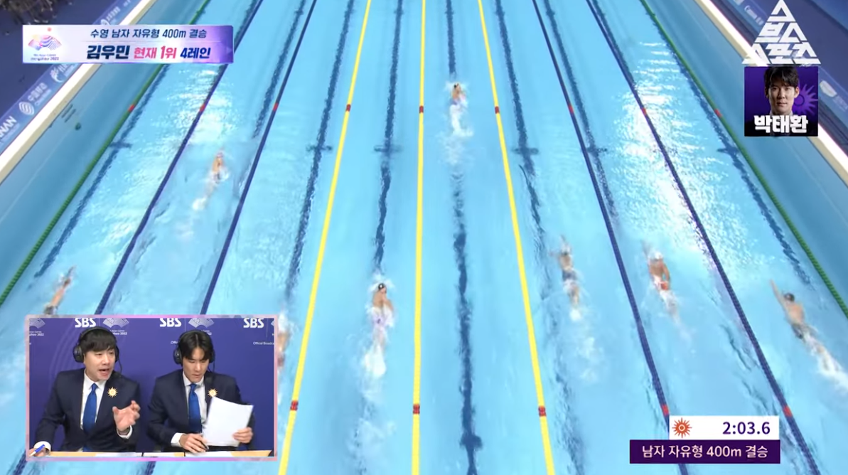 다른 선수들과 허리이상 차이를 내고 있는 장면은 정말 압권인데요. 턴도 굉장히 부드럽게 하면서 레이스에 집중하는 좋은 모습을 한번 영상으로 확인해보세요. 그리고 200미터 변환점에서는 가장 빠른 속도를 내고 있는데요. 이 구간이 굉장히 힘들어하는 구간이라고 합니다. 박태환선수가 해설하는 장면으로 준비했습니다.