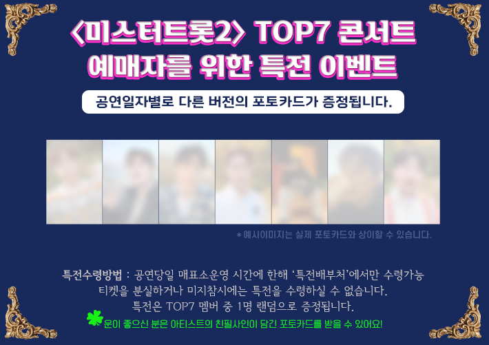 미스터트롯 2 TOP7 콘서트 예매자들에게 특전 이벤트를 제공한다고 하는데요. 특전 수령방법은 공연당일 매표소 운영 시간 안에 '특전배부처'에서만 수령가능한 포토카드가 증정됩니다.