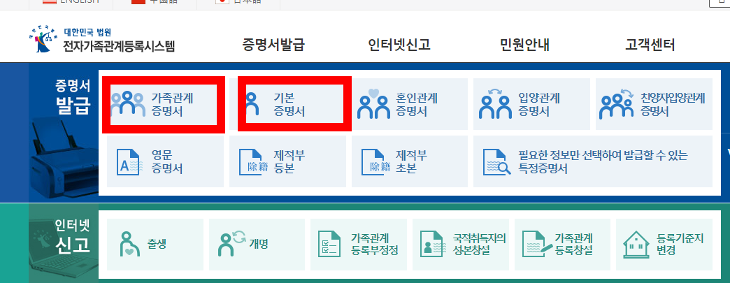 민원 24에서 많이 찾는 서류로 기본증명서와 가족관계증명서, 혼인관계증명서가 있는데요. 이는 전자 가족관계등록시스템에서 발급이 가능하니 아래 사이트에서 발급하셔야 합니다.