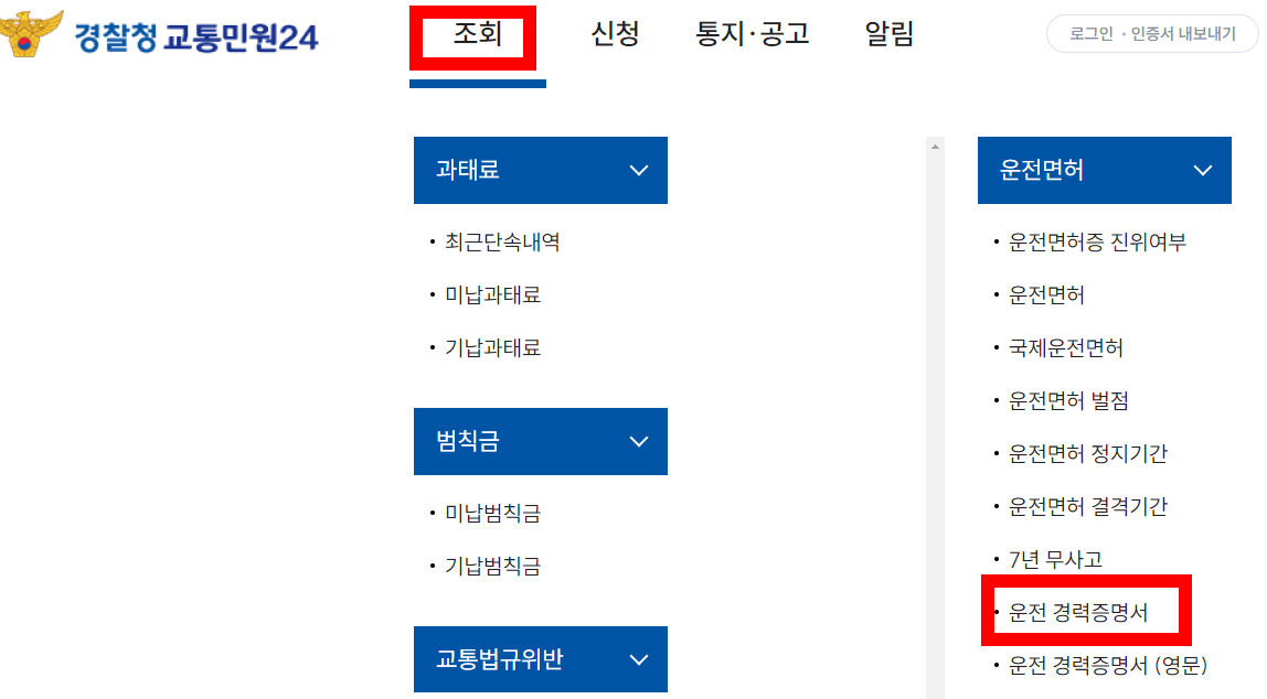 경찰 민원포털에서 운전경력 증명서 발급이 가능합니다. 미납 과태료, 미납 범칙금 조회도 가능합니다.