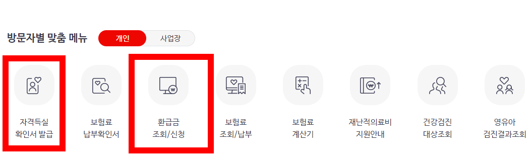 여기서는 건강보험금 환급금 대상자 조회 신청도 가능합니다.
