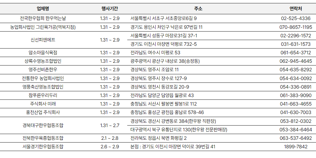 이번 행사에는 강원한우(강원), 녹색한우(전남), 서경한우(경기), 안동봉화축협한우(경북), 우리 한우 365(경북), 울산축협한우(울산), 장수한우(전북), 지리산 순한 한우(전남), 토바우(충남), 한우왕(경북), 홍천한우(강원) 등 전국 각 지역의 총 11개 브랜드가 참여한다고 합니다.