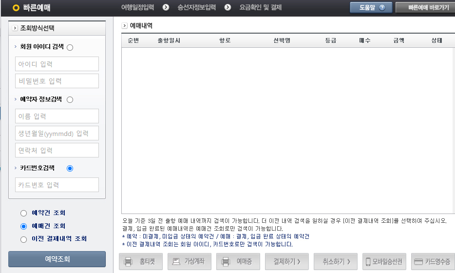 빠른 예약 조회를 원하시면 우측 상단의 빠른 예매 해서 진행하시면 됩니다.