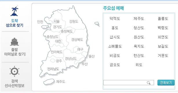 인천, 포항, 통영, 여수, 제주도, 부산 등 여객선 예매 사이트 '가보고 싶은 섬'을 소개합니다. 도착 섬으로 조회, 출발 터미널로 찾기 등으로 이용이 가능합니다. 실시간으로 운항정보도 알 수 있으며 운항시간표도 조회 가능합니다.