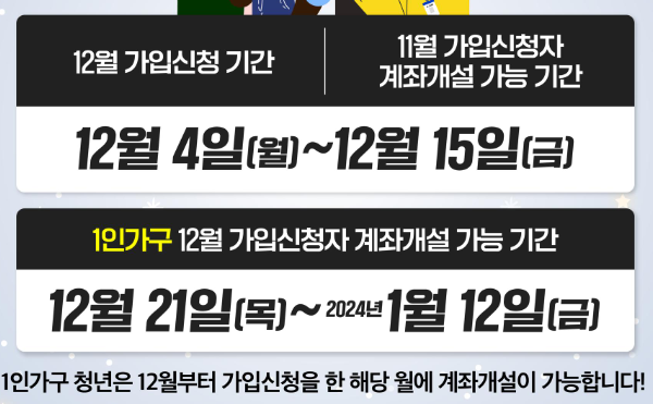 ● 2023년 12월 가입신청 기간: 2023년 12월4일(월요일) ~ 2023년 12월 15일(금요일)까지