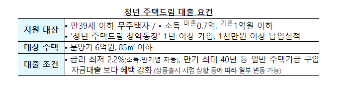 ▶ 두 번째: 6억 원 이하의 85제곱미터 이하의 아파트 분양가에 당첨이 되어야 해당. 실제 분양가 80% 최저 2.2% 최장 40년 빌려주는 통장입니다. 이게 청년드림 대. 출 연계입니다. 단! 무주택자 소득 연 7천만 원 이하, 기혼은 1억 원입니다.